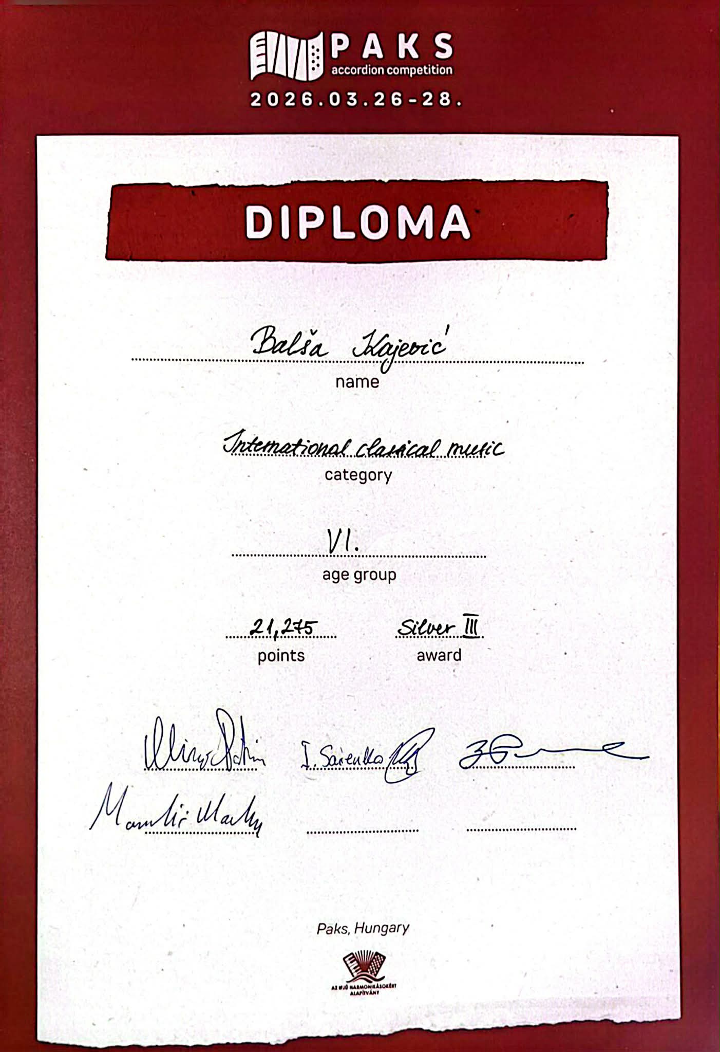 СМЈЕР ЗА ХАРМОНИКУ – НАГРАДЕ СТУДЕНАТА НА ТАКМИЧЕЊУ У МАЂАРСКОЈ