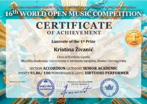 Na onlajn takmičenju 16th World open music competition održanom 19. decembra 2025. godine, studenti Smjera za harmoniku Vladan Prodanović, Кristina Živanić i Ajdin Muftić, u klasi mr Danijele Gazdić, red. prof., osvojili su I nagrade.