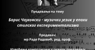 Predavanje na temu: „BORIS ČAJKOVSKI – MUZIČKI JEZIK U EPOHI STILSKOG EKSPERIMENTALIZMA“ Predavač: mr Rade Radović, red. prof. Kamerna sala Muzičke akademije UIS Petak, 27. februar 2026. u 17 časova