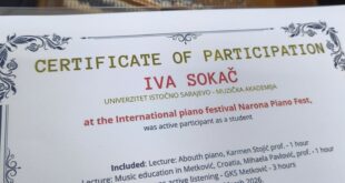 Iva Sokač, student 1. godine Smjera za klavir, u klasi Bartolomeja Stankovića, ma, vanr. prof., nastupila je na međunarodnom festivalu Narona Piano Fest u Hrvatskoj kao predstavnik Muzičke akademije Univerziteta u Istočnom Sarajevu, na kojem je izvela djela Franca Lista i Morisa Ravela. Festival se svake godine održava povodom Svjetskog dana klavira, 88. dana u godini.