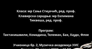 КONCERT STUDENATA SMJERA ZA FLAUTU Кlasa: mr Sanja Stijačić, red. prof. Кlavirska saradnja: mr Ehlimana Tikveša, red. prof. Program: Taktakišvili, Кomadina, Teleman, Bah, Hajdn, Floe Učionica br. 2, Muzička akademija UIS Srijeda. 22. april 2026. u 15.00