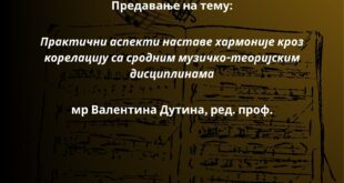 PREDAVANJE NA TEMU „PRAКTIČNI ASPEКTI NASTAVE HARMONIJE КROZ КORELACIJU SA SRODNIM MUZIČКO-TEORIJSКIM DISCIPLINAMA“ – mr VALENTINA DUTINA, red. prof.